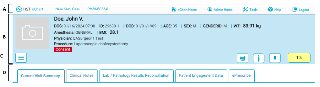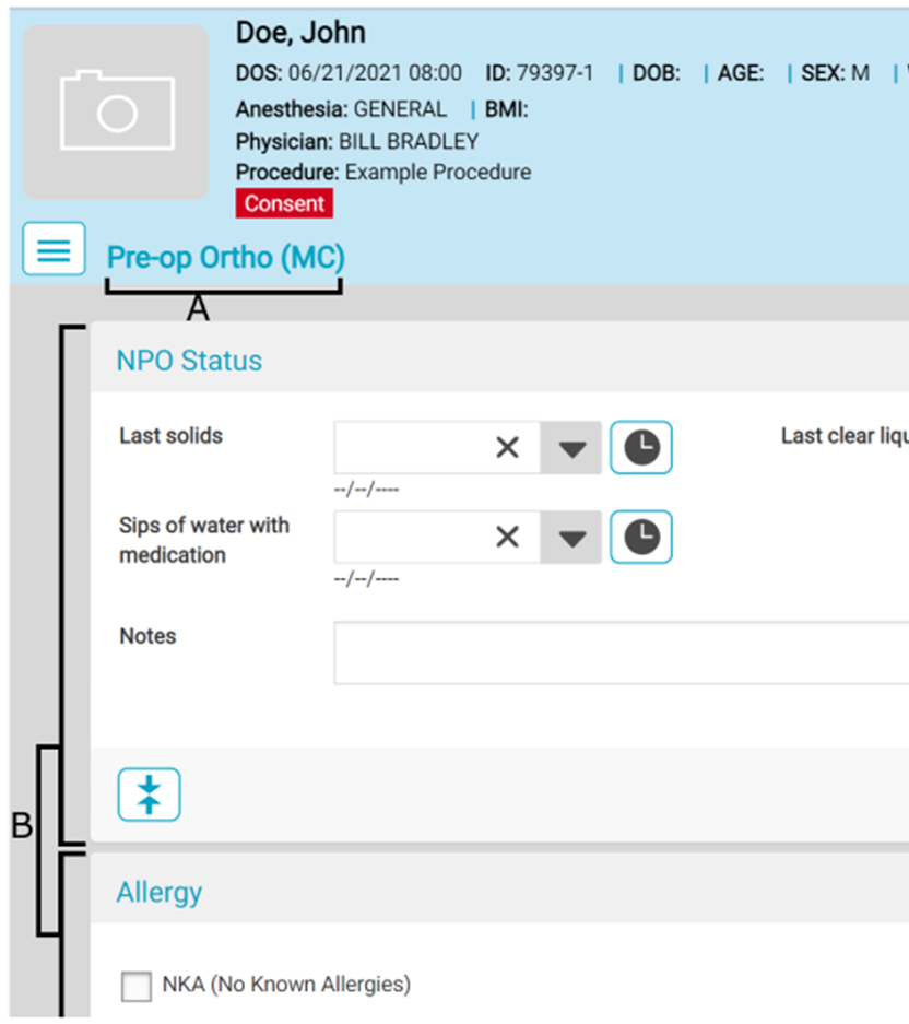 • B: The Patient Header – The patient header is always present at the top of a chart, no matter the workflow. If a patient photo has been taken, it will display on the left-hand side. The patient header also contains: the patient’s name, the date of service, patient’s ID, age, sex at birth, gender identity, weight, BMI, planned anesthesia type, Provider’s name, and scheduled procedure(s). Certain alerts may also display beneath the patient information.