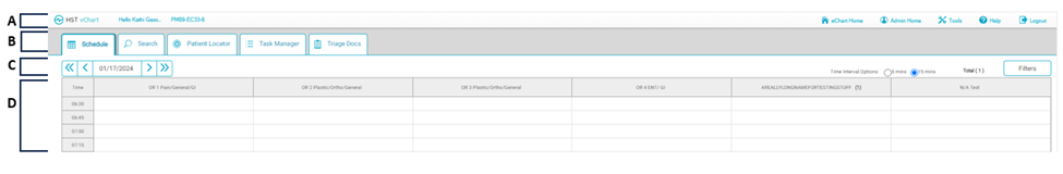 • B: Schedule, Search, Patient Locator, Task Manager, and Triage Docs Tabs – The eChart Schedule Tab displays the scheduled cases. The Search Tab allows the user to search for a chart. The Patient Locator Tab displays the location and status of patients currently at the Center. The Task Manager Tab is where users view the tasks that have been assigned for them to complete. In the Triage Docs Tab operative reports are triaged and attached to charts.