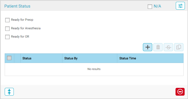 • Ready for Anesthesia: this status can be set by checking the associated box in the Patient Status BLOC. This status will disappear when the Anesthesia Start Time BLOC is completed or the Room In BLOC is completed in the Intra-Op Workflow.