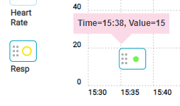 To document respiration or heart rate, tap and drag the appropriate icon onto the graph. While dragging the icon, a call out above it will indicate the time and value for its current location on the graph. When the icon is at the desired time and value, release the icon to complete the documentation. The heart rate will be recorded as Pulse or EKG dependent upon which Heart Rate source radio button is selected for the BLOC.