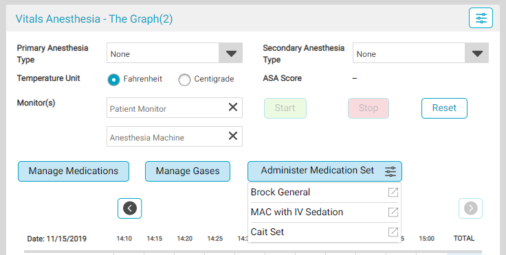 - Tap the Administer Medication Set button in the BLOC. This button is located adjacent to the Manage Medications and Manages Gases buttons. A drop-down will appear displaying all active Anesthesia Medication Sets.