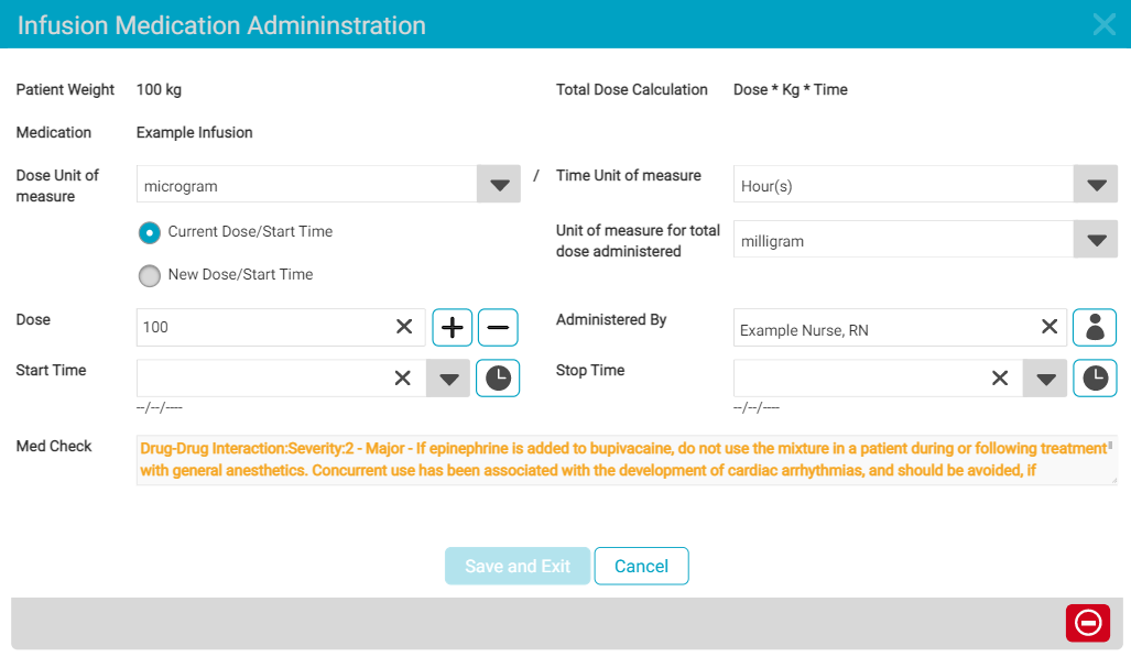 - Edit the Dose field and/or Start Time as necessary. Dose Unit of measure, Time Unit of measure, and Unit of measure for total dose administered may not be edited after an infusion is started.