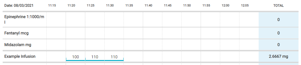 Infusions are included in the Table and are visually separated from standard dose medications by bold table lines. When an infusion is or was running, the infusion dose will display in the appropriate time cells on the table and a blue line appears at the bottom of the cells. Infusion start and stop times are indicated on the blue line using vertical hash marks.
