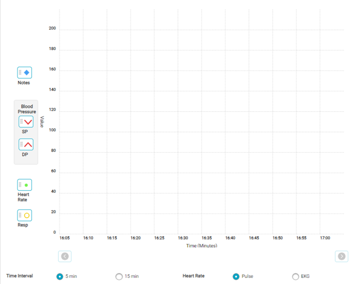 - The Graph displays anesthesia notes, blood pressure, heart rate, and respiration. These values can be input multiple ways. They may be brought in via a patient monitor interface, the drag and drop icons, or by entering them in the Grid View.