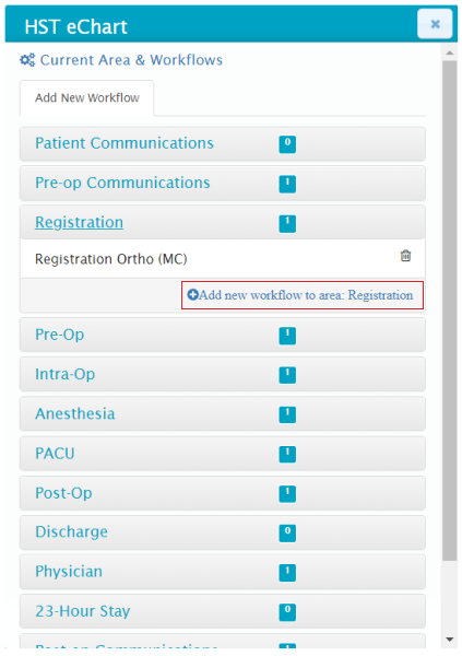 There will be times when a user needs to add a workflow or a bundle (a group of workflows, such as Intra-op, Anesthesia, and PACU) to a chart, e.g. incorrect procedure scheduled, or Return to OR. This topic covers adding or removing an individual workflow. For information on adding a bundle or returning to the OR, see Add a Bundle
