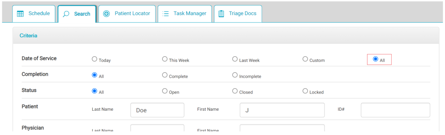 • To search for a patient's charts for ALL dates of service, enter the Patient ID or the first three letters of their last name and at least the first letter of their first name; then an "All" radio button will appear as a Date of Service option.