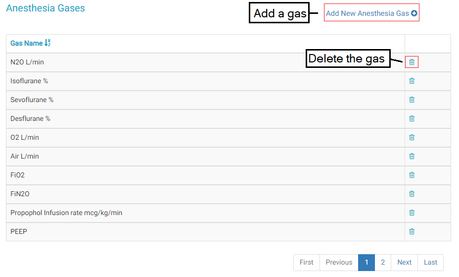 Note that there is no edit icon in the Anesthesia Gases table. Users are not able to edit entries. Instead, the user must delete the entry they wish to change and then create a new, corrected entry.