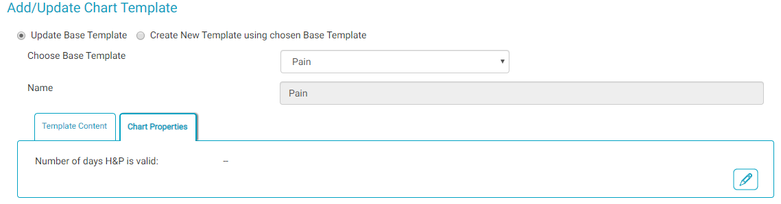 The "Number of days H&P is valid:" setting determines how many days from the date performed a scanned History and Physician is valid. (Only valid H&P documents can be used in the History and Physical Attestation BLOC.) The default value is 30 days. The value can be changed to any value from 1 to 365, but this must be edited in the Add/Update Chart Template page.