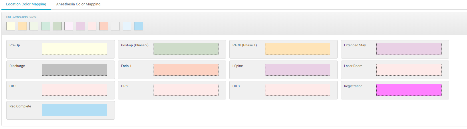 Color Mapping is used to set the colors for the patient locator and anesthesia types. Anesthesia type color appears as a thin strip of color down the right side of the patient’s scheduled appointment on the HST eChart schedule. Location color mapping is used in HST eChart on the schedule, in the Clinical Patient Locator, and in the Public Patient Locator. Color Mapping can be accessed in Admin Home in the Configuration section.