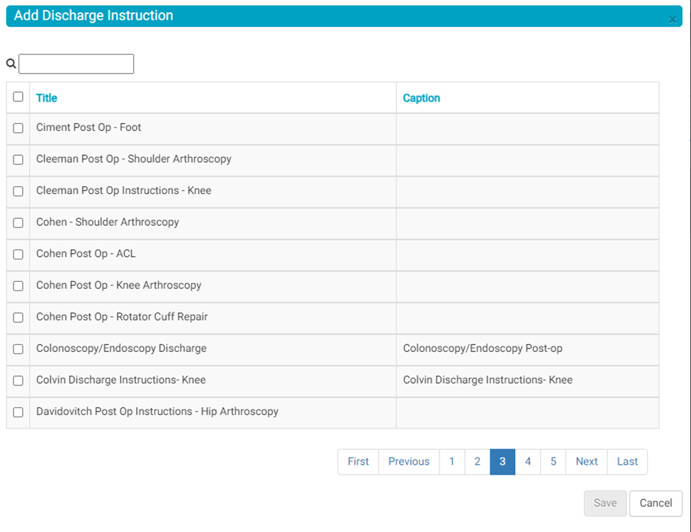 - You can search for the Discharge Instruction to be added using the type ahead search field, or you can visually look in the list that populated the flyout allowing you to multi-select and add multiple instructions at one time. Check the box(es) next to the desired Discharge Instruction(s) and tap Save. The Discharge Instruction(s) will be added to the Set.