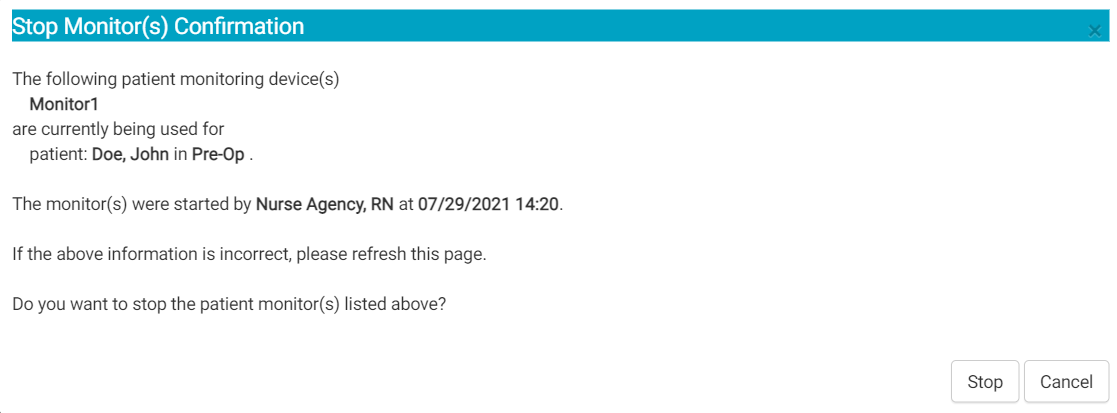- If an edit icon is present in the "Stop Monitor" column, tapping the icon will open a confirmation flyout where the user can stop the monitor from recording data to a patient chart. The flyout displays the name and location of the patient whose chart is currently collecting the data. The flyout also displays the monitor name, the user who started the monitor, and the time at which the monitor started recording data. To stop the monitor, tap the Stop button in the flyout.