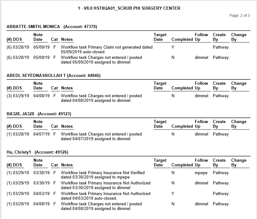 Notes are available in many areas of the system. This report will print all notes both user and system generated. Notes can be printed by category, target dates, assigned to, status, patient ID or account.
