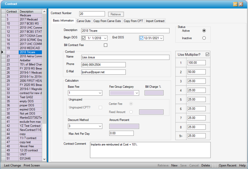 NOTE: When 5 - % of Billed Charges is utilized, Carve Outs will be ignored. Consequently, if a contract pays a % of billed charges but also has Carve Outs, the best way to set it up is by using 1 - Center Fee as the Base Fee, and 1 - Discount Fee by percentage as the discount method, and then discounting the fee down to the percentage which is the contracted rate.