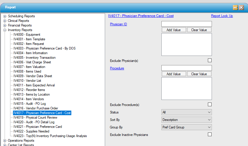 Many centers use this as a Pick List to gather the day’s supplies. If so, grouping by Preference Card Group or Inventory Location may make picking easier.