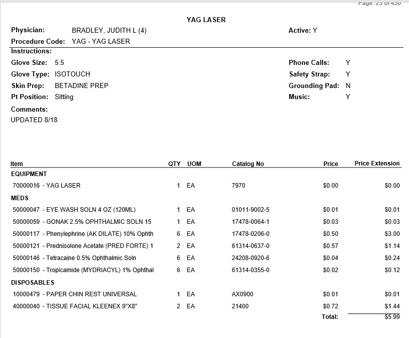 Detailed preference card information which includes costs for the items entered on the Physician Preference Card. Prints a new page for each Preference Card if multiple cards selected.