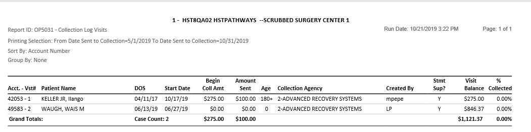 This report can be generated either by the date of service or the date the visit was sent to collections. The balance due can also be specified along the collection company the balance has been turned over to.