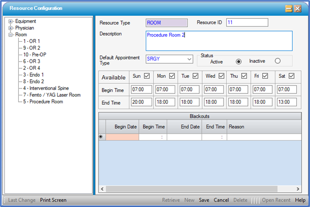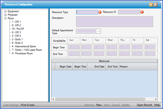 Note: Double clicking on any particular room, physician, or equipment, will open Resource Configuration.