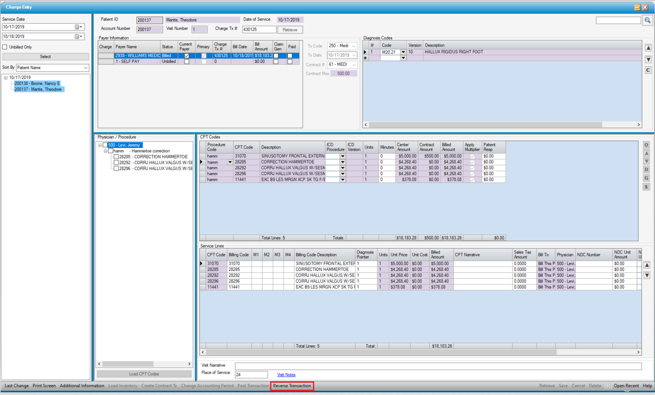 NOTE: Edits that do not change the amount billed, such as updating modifiers or diagnosis codes, can be made without reversing the transactions. When a charge is reversed , HST Practice Management will retain all CPTs entered on the CPT Codes grid in Charge Entry. The original codes are then available to load to the Service Lines once any other required corrections have been completed.