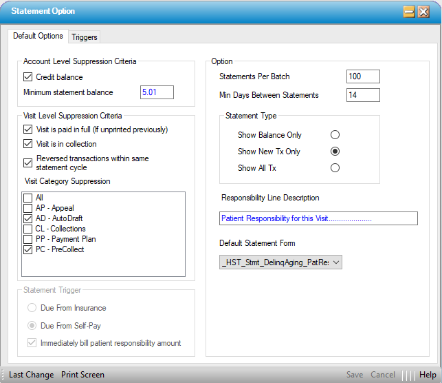 Use the Statement Option form to associate the messages created in Statement Message with the appropriate Triggers, and set additional configuration such as Account Level Suppression Criteria, Visit Level Suppression Criteria, Default Statement Form, etc.