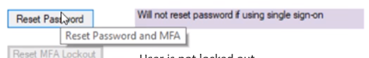 This button is only enabled if Multi-Factor Authentication (MFA) is enabled at a center this user has access to and their account is locked. When an account is not locked, the following message will display next to the button: User is not locked out. When the account is locked the message next to the button displays: Account is locked. When this button is clicked, the account is reset and the message will display The Account has been reset. This option can be accessed by those users who have permission to Reset Passwords. The hover message for this button reads Reset MFA Lockout Only. This option does not affect user passwords.